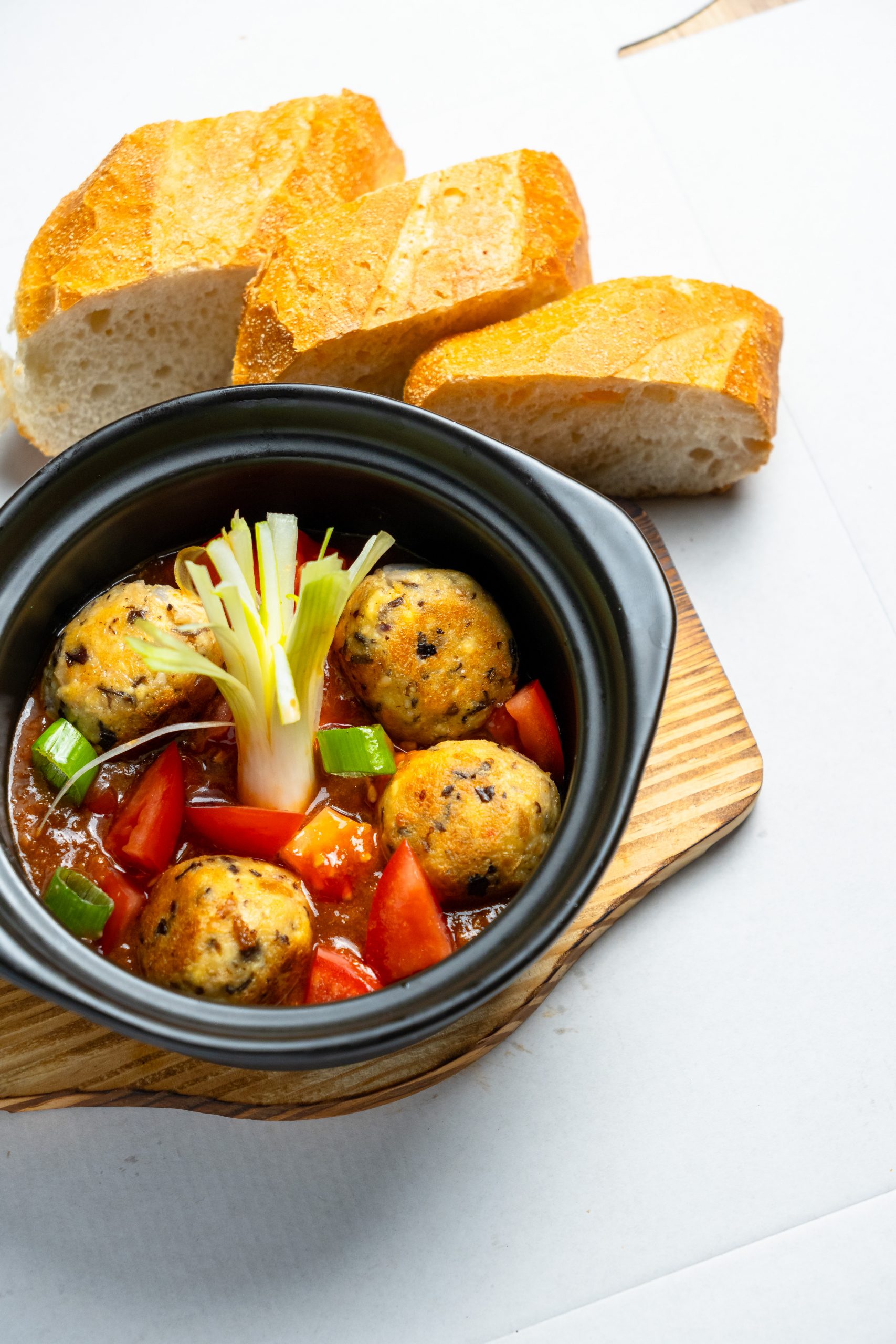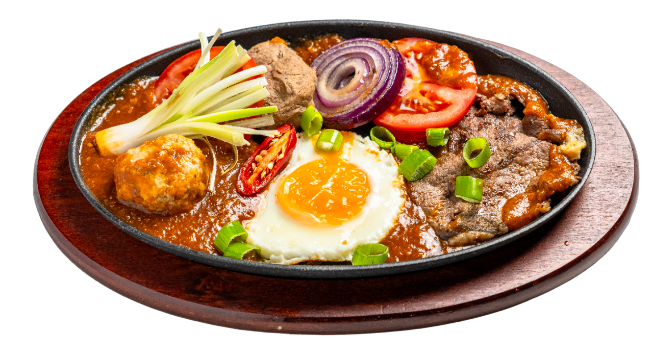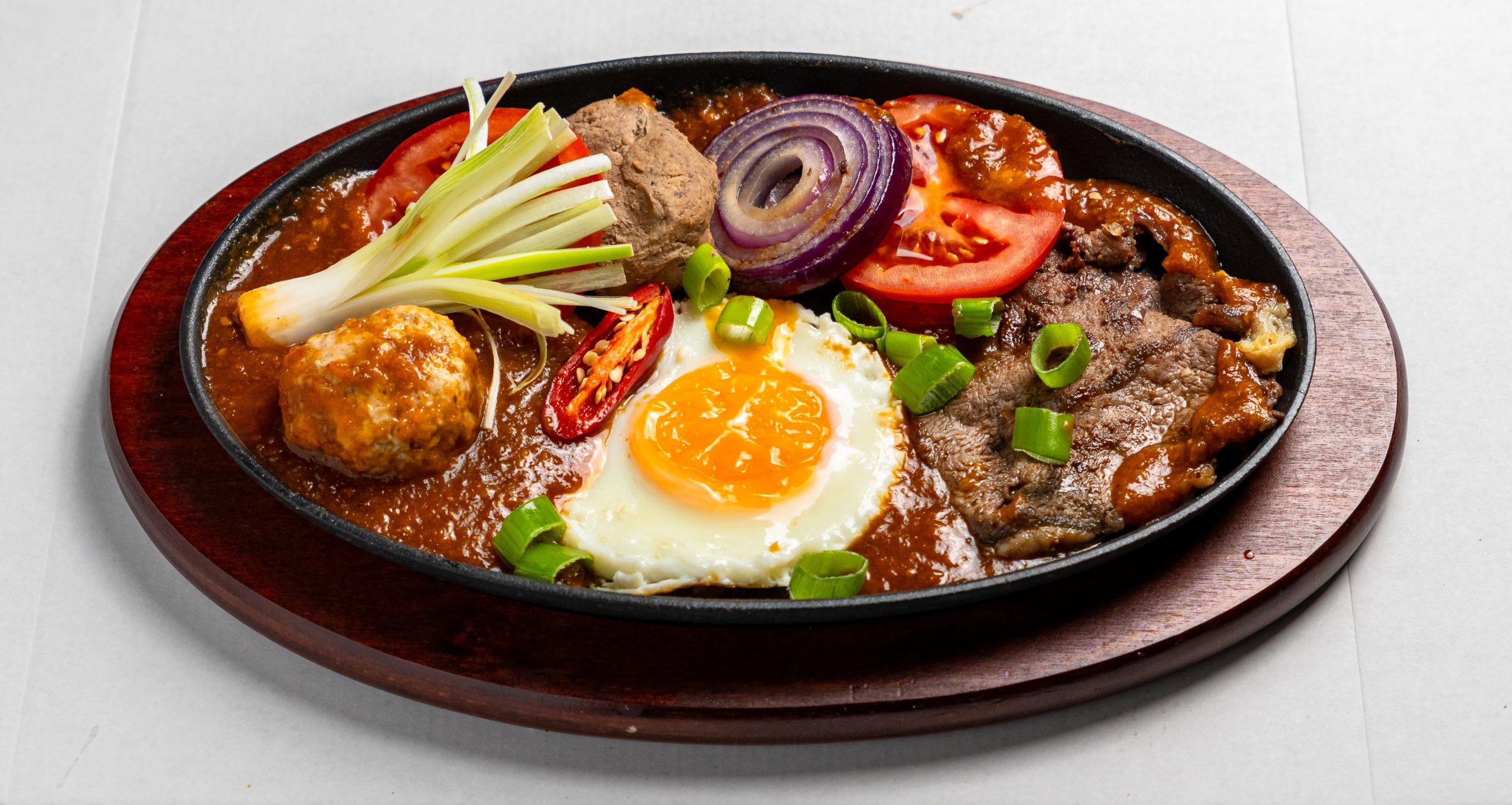 Speziale Pfanne, serviert mit Baguette (Pate, vietnamesische Hackbällchen, Rindfleisch, Eier, Zwiebel und Tomaten)