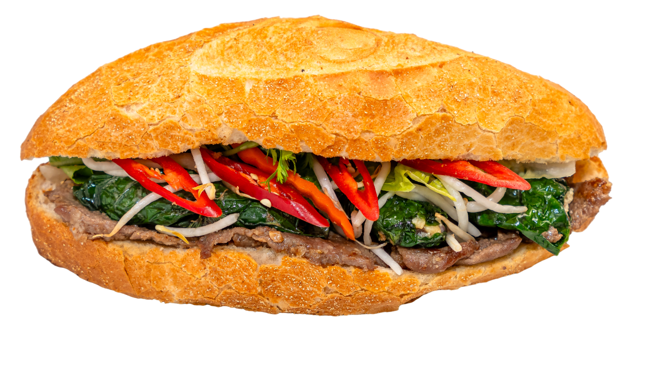 Knuspriges Baguette mit Fleisch, Gemüse, Kräutern und würziger Sauce.